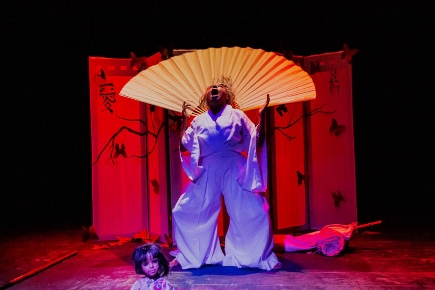 La mecánica de las imágenes y personajes fantásticos, que acompañan a la protagonista, son desarrolladas por una persona vestida de negro, recurso tomado del teatro kabuki, donde los llamados kuroko, funcionaban como actores invisibles.